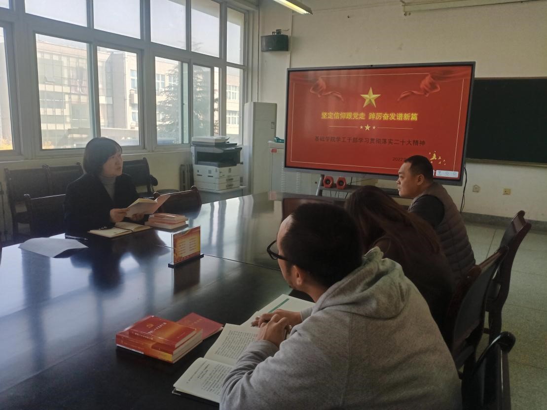 2022年11月15日上午,基础学院学工干部深入学习贯彻二十大精神在教6-412召开,基础学院党委副书记张艳霞、辅导员韩寒、杨萌、刘文聪参加会议,会议由张艳霞主持。