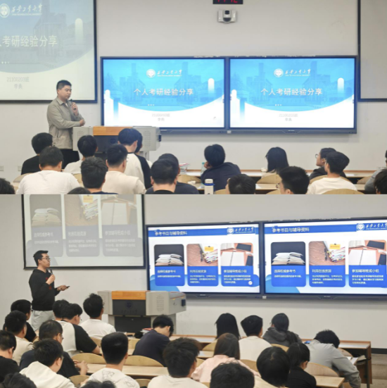 2025届薛智超同学高分上岸本校,他结合自身经验,分享统考科目复习要点:李典同学重点聚焦择校策略,通过“学科评估排名+历年报录比+专业课难度”三维度进行目标筛选。互动交流环节,同学们就“如何平衡课程与考研”“专业课如何高效复习”等问题踊跃提问,两位分享者结合实例一一解答。最后曹磊总结强调:“考研是持久战,希望同学们以榜样为镜,早规划、重执行、稳心态。”