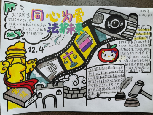 自2025年12月8日启动以来,活动吸引了全校学生的广泛关注与积极参与。同学们围绕宪法知识、校园安全、网络安全、交通安全、防范诈骗等主题,创作出一幅幅内容丰富、设计精美、寓意深刻的手抄报作品,充分展现了我校学子扎实的法治素养、活跃的思维能力和积极的创作热情。