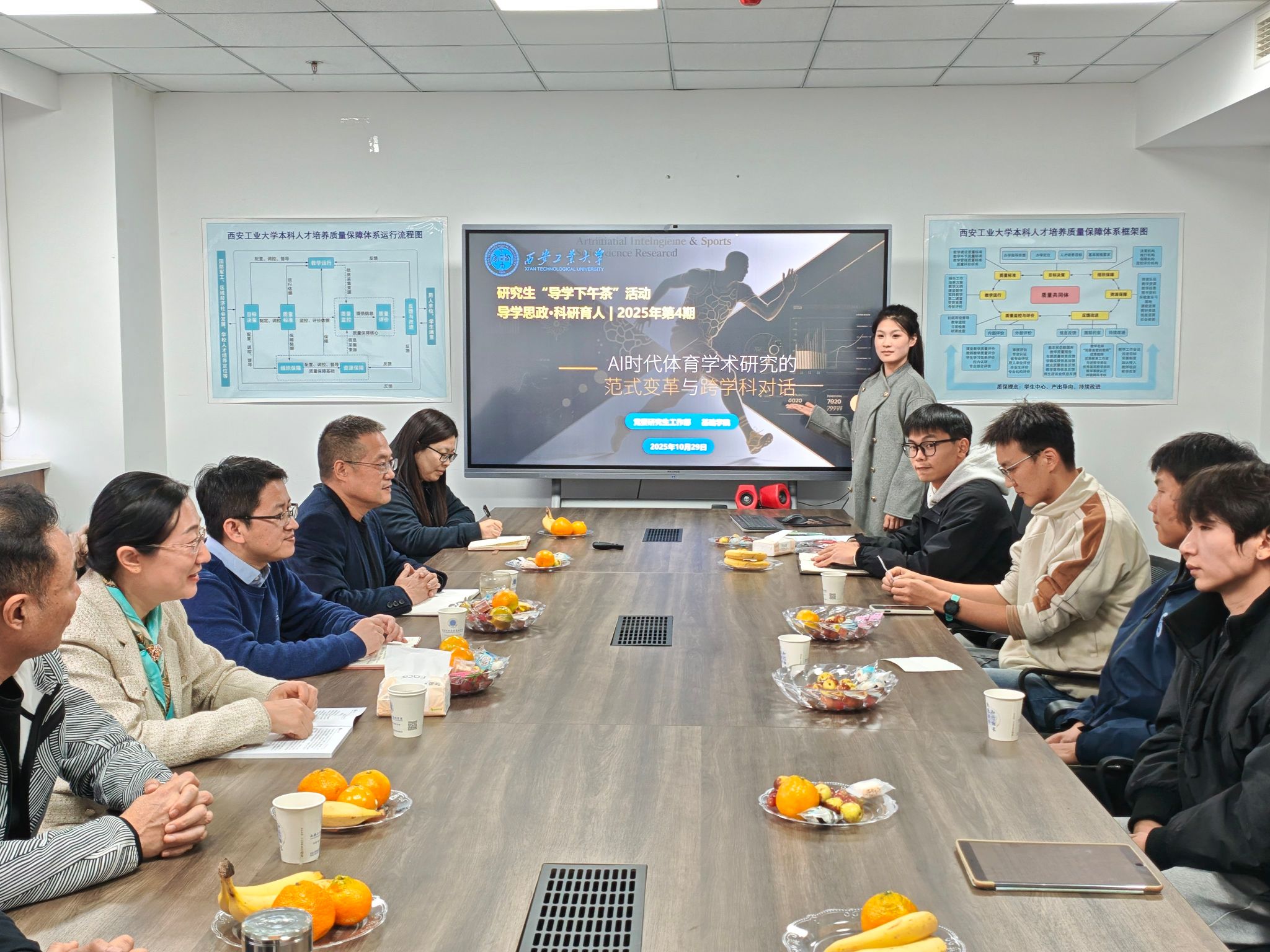 为助力研究生把握AI技术对体育学术研究的深刻影响,探索跨学科研究新路径,10月29日下午17:00-18:30,由西安工业大学党委研究生工作部主办、基础学院承办的研究生“导学下午茶”2025年第4期活动在双创楼401顺利开展。本次活动以“AI时代体育学术研究的范式变革与跨学科对话”为主题,本次活动由研究生冯涛主持,学院党委副书记张艳霞、副院长吴亚杰教授、副院长文安教授,以及王兵教授、赵权副教授、谢新涛副教授、齐朝勇副教授、崔立根副教授、李海凤副教授等多位教师出席。
