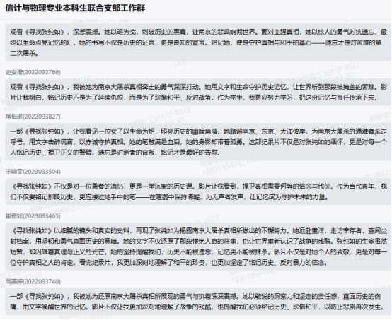 观看过程中,全场肃然,党员同志们无不为张纯如女士的坚韧勇气与历史担当所震撼。观影结束后,全体党员心潮澎湃,随即通过线上支部群开展了热烈的学习交流与心得分享。大家一致认为,这部纪录片不仅加深了大家对南京大屠杀这段民族苦难史的理解,更让人深切体会到“铭记历史、珍爱和平”的深刻内涵与沉重分量。有党员动情地写道:“张纯如女士用生命之光烛照历史暗角,她的勇气与良知如同一座灯塔。作为新时代的青年党员,我们更应铭记屈辱、奋发图强,将爱国之情转化为强国之志、报国之行。”其他党员也纷纷表示,要以张纯如女士为榜样,坚定理想信念,锤炼过硬本领,自觉将个人成长融入国家发展大局,以实际行动肩负起时代赋予的责任。