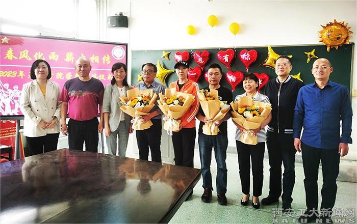 院领导为四位退休教师送上鲜花、荣休纪念品并合影留念。